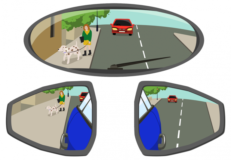 Your side mirrors should be adjusted so you can see a little bit of the side of the car, a fair bit of sky and plenty of road.