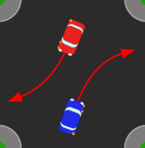 Notice how both cars are deliberately cutting the corner and leaving some free space in the centre of the junction. This enables them to pass each other safely.